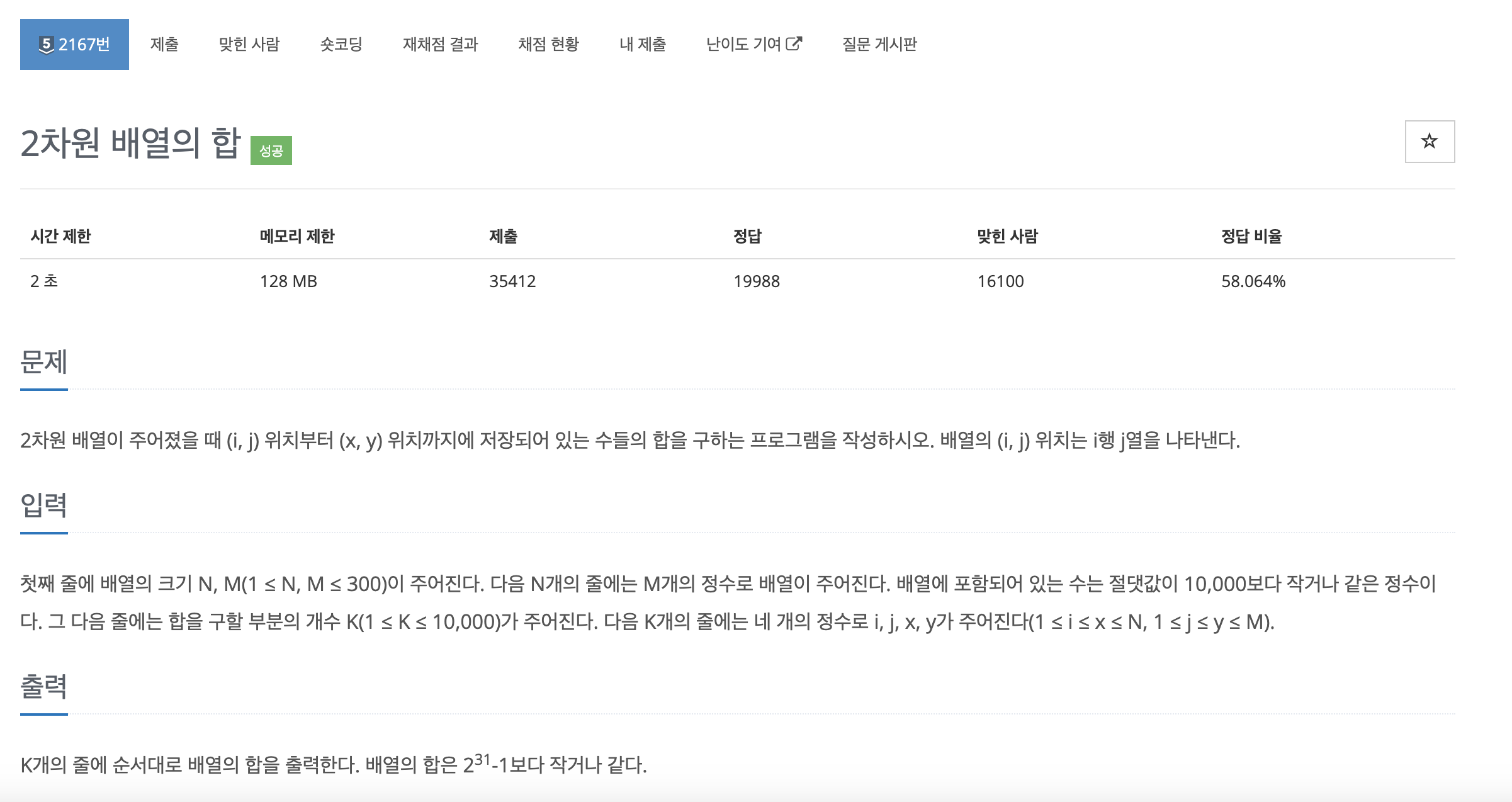 : sum=ary[x][y]−ary[i1−1][y]−ary[x][j1−1]+ary[i1−1][j1−1] - ary[x][y]: (1,1)부터 (x,y)까지의 전체 합