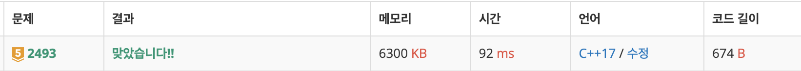 - 스택이 비어 있지 않으면, height와 s.top().first(이전 탑의 높이) 비교