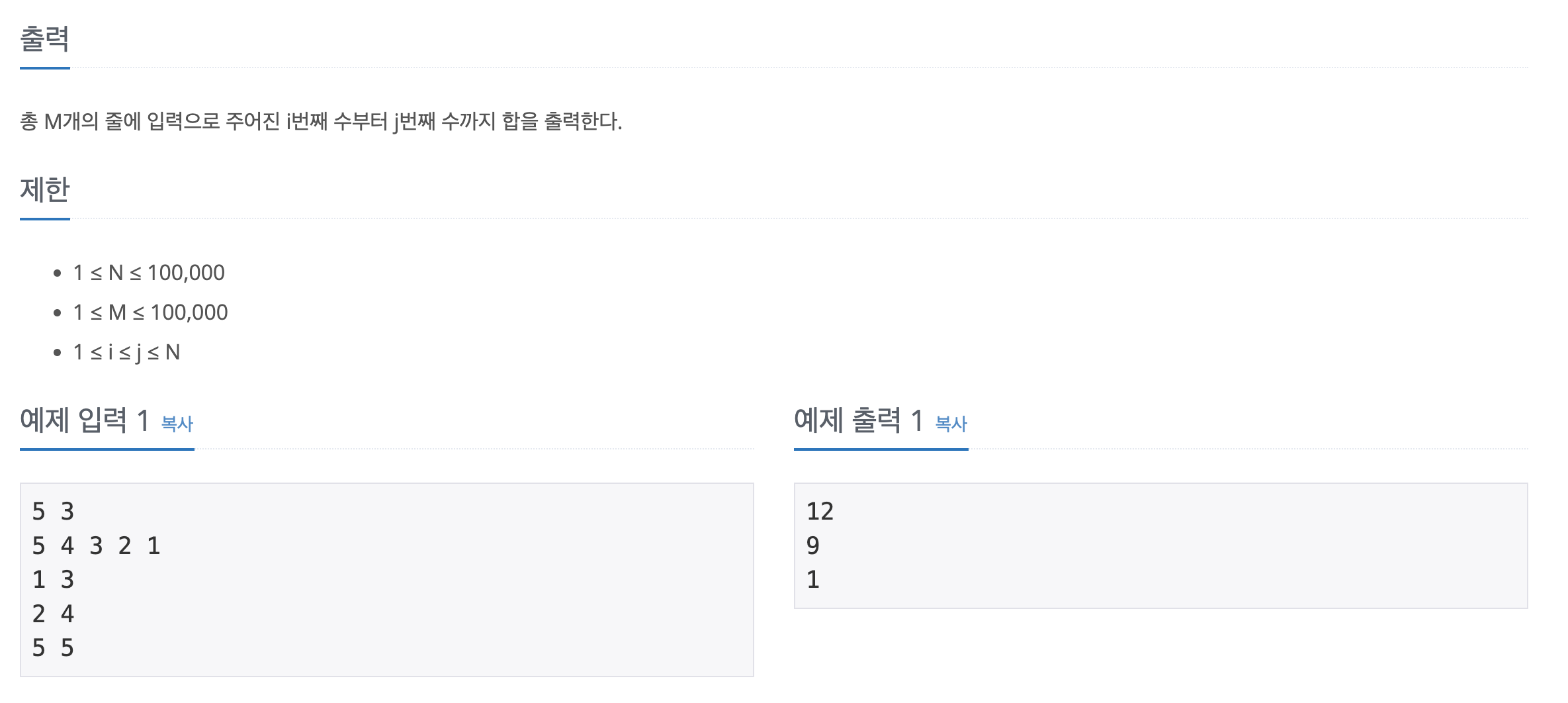 구간 합에 대한 기본적인 지식이 없다면 풀 수 없는 문제이지 않을까 싶다.