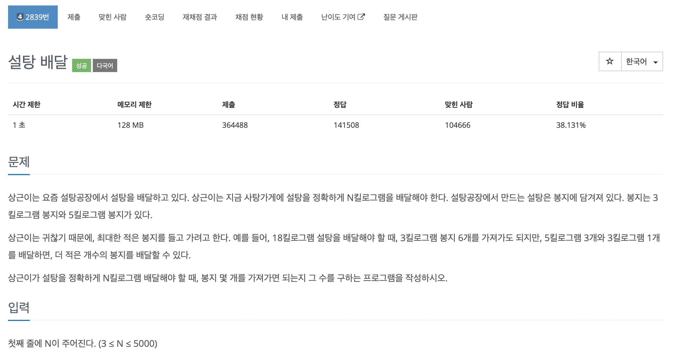 우리는 설탕 봉지의 개수를 출력해야하므로,