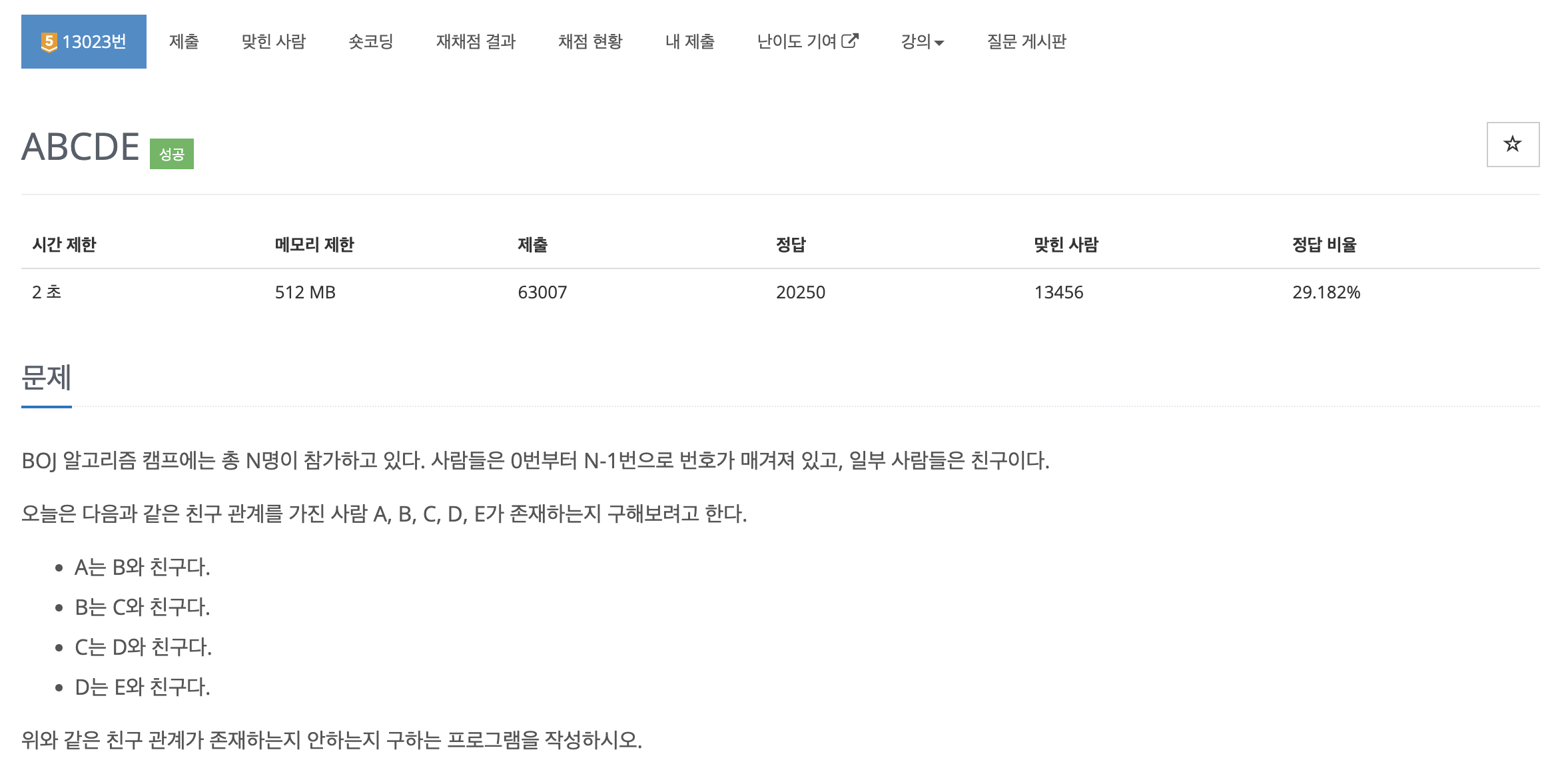 골드5의 난이도였다. 이번 문제는 유튜브 영상 강의의 도움을 받았다. DFS도 BFS도 개념은 알고 있는데 코드로 구현하는 것이 항상 어려웠다. 그래도 이번 문제를 해결하면서 코드로 구현하는 방법에 대해서 많이 익숙해진 것 같다. 백준 13023번 문제의 알고리즘 분류는 '그래프 이론', '그래프 탐색', '깊이 우선 탐색', '백트래킹' 이었다. 어렵다.. 더 많은 문제를 풀고 익숙해져야겠다.