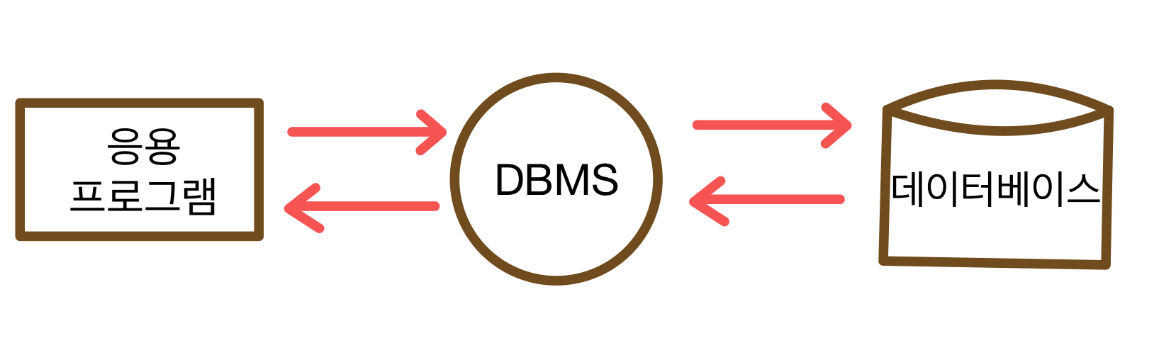 다시 말해서 응용 프로그램이 필요한 데이터 작업을 DBMS에 요청하면 DBMS는 자신이 관리하는 데이터베이스로 관련 작업을 수행하고 결과를 제공한다.