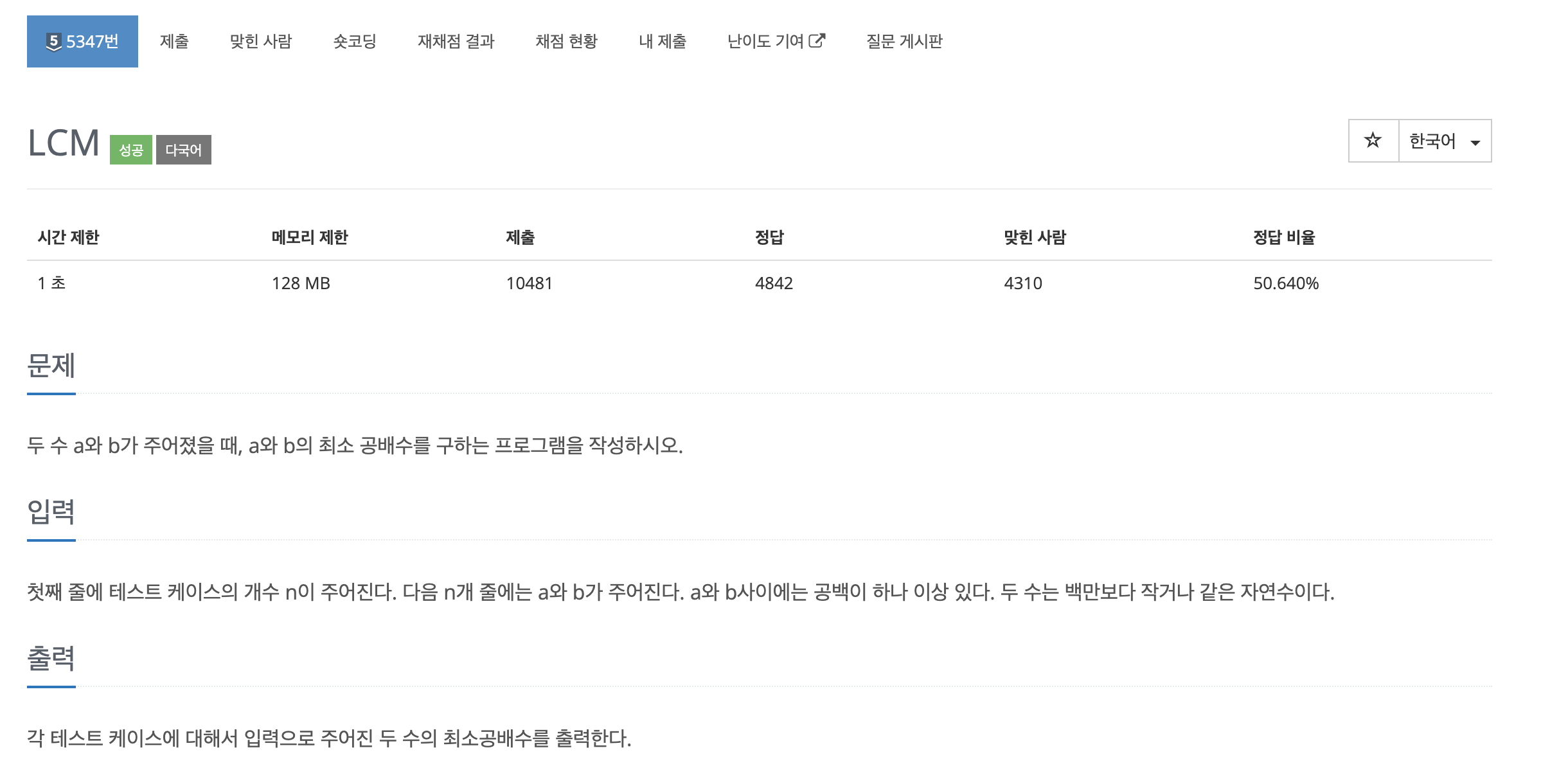 두 수의 최소공배수를 출력하는 간단한 문제이다.
