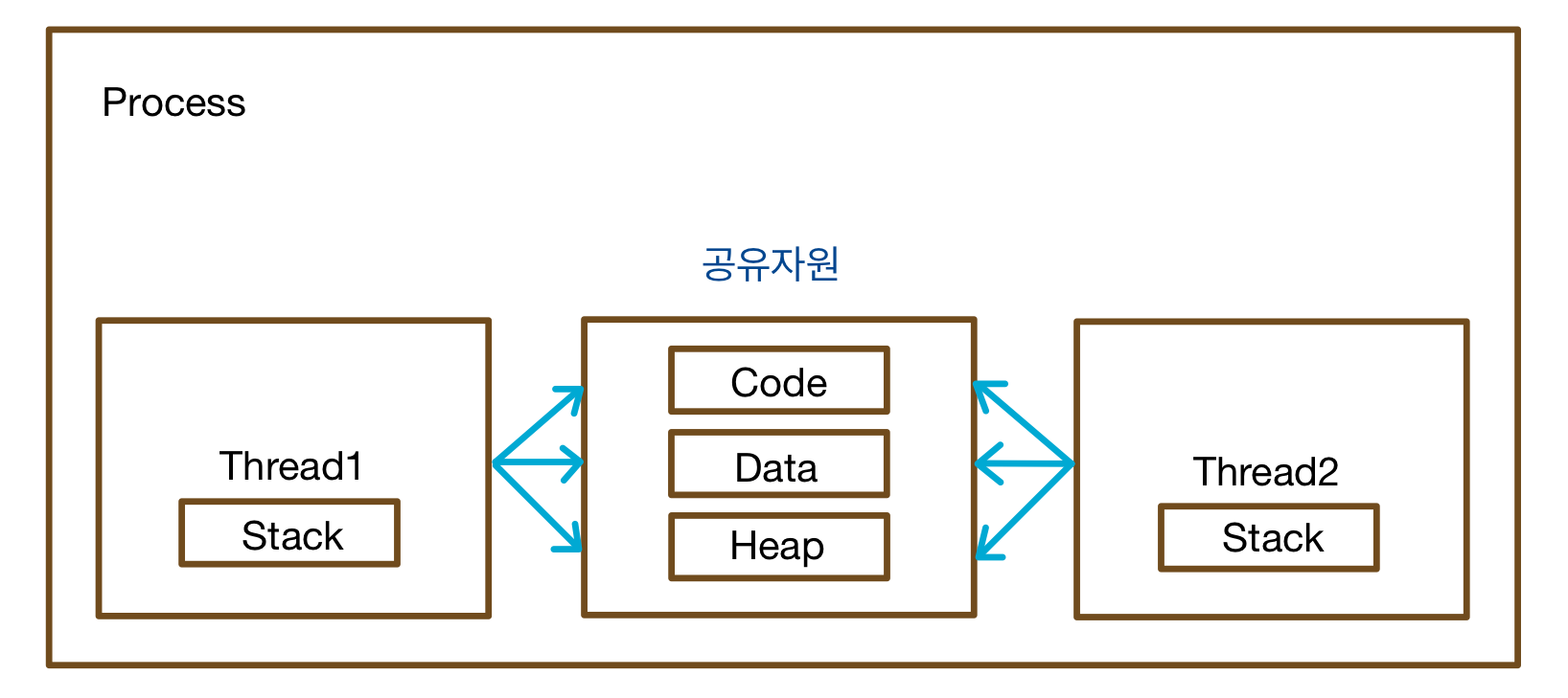 - 각 스레드는 독립된 스택 영역을 가지지만, 부모 프로세스의 코드, 데이터, 힙 영역을 공유한다.