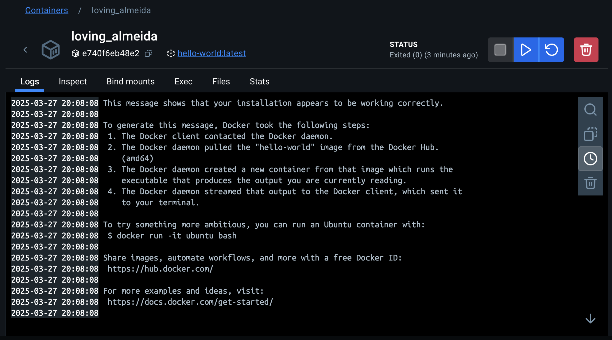 아까전에 터미널 창에서 확인했던 내용이 Logs에 표시되는 것을 볼 수 있다.