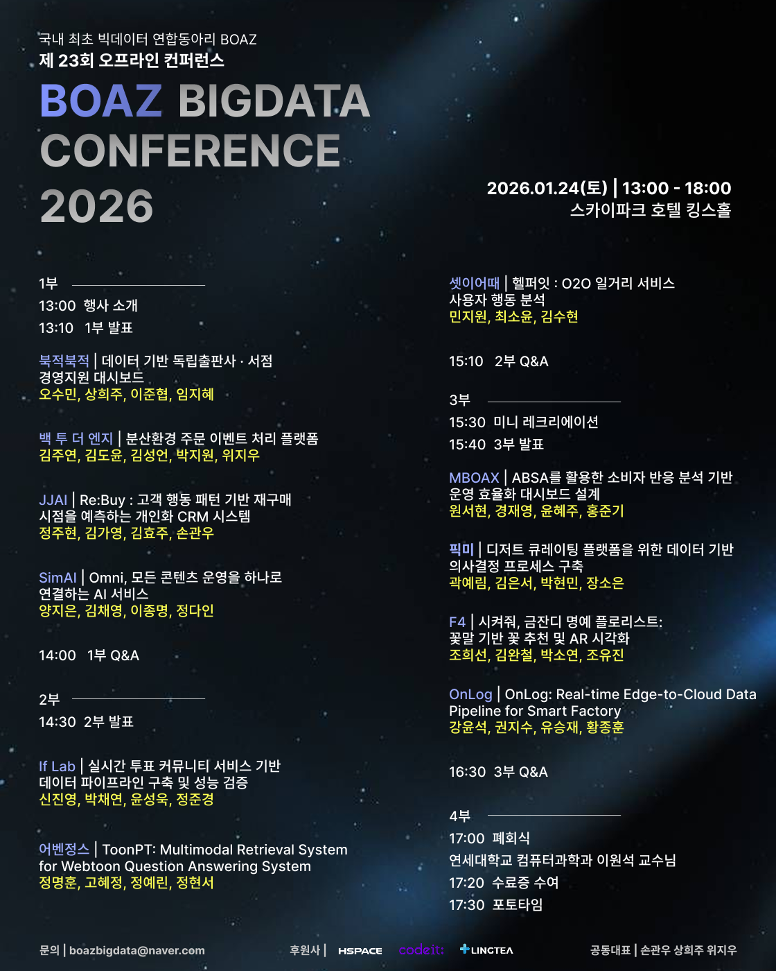 국내 최초 빅데이터 연합동아리 BOAZ에서 제23회 빅데이터 컨퍼런스를 개최합니다!