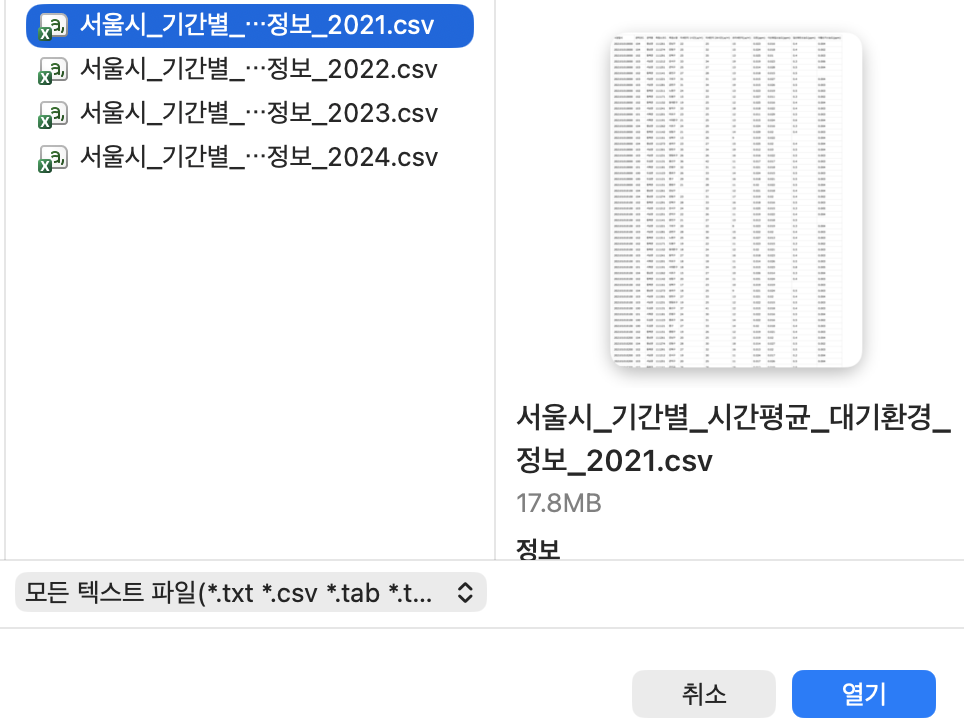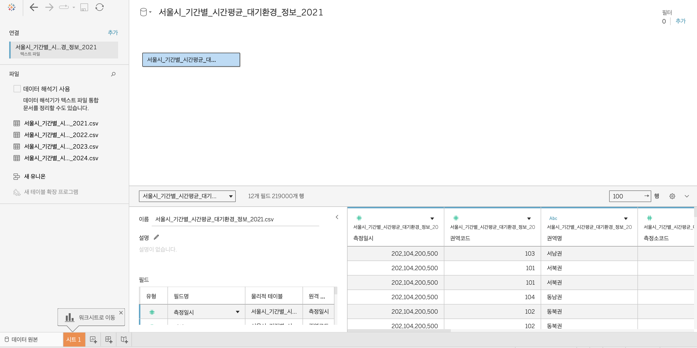 왼쪽과 같은 화면이 보이면 서울시_기간별_시간평균_대기환경_정보_2021 을 제거해준다.