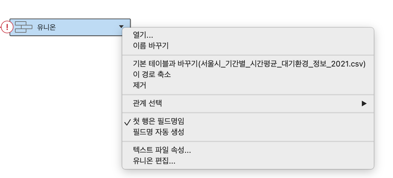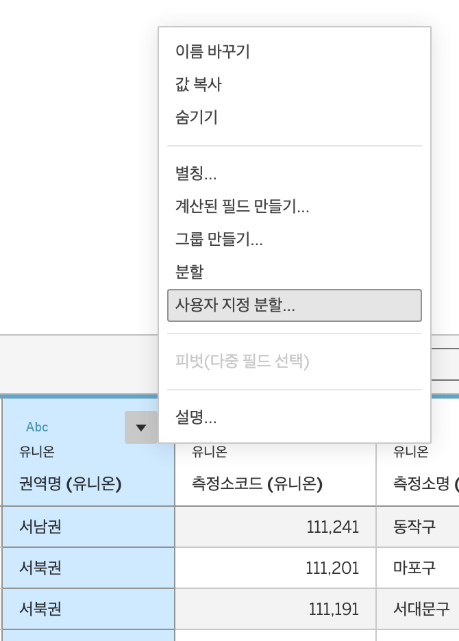 1. 데이터 원본 화면에서 권역명 (유니온) 필드 우클릭