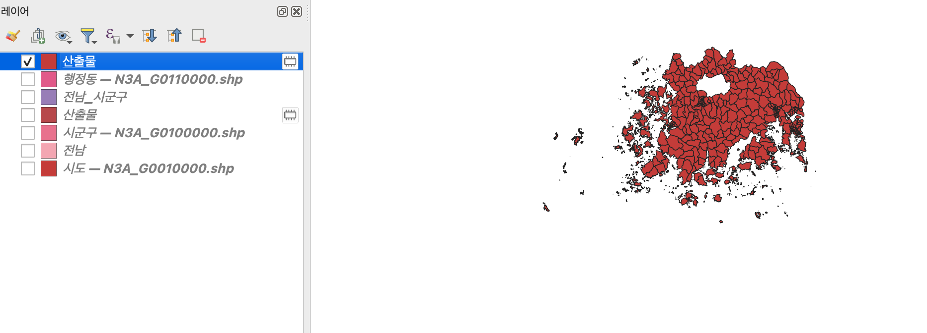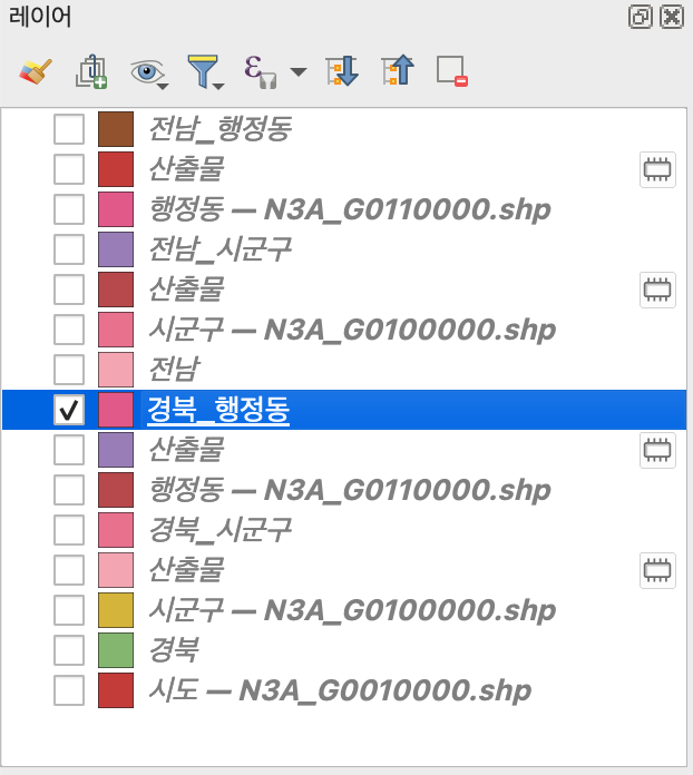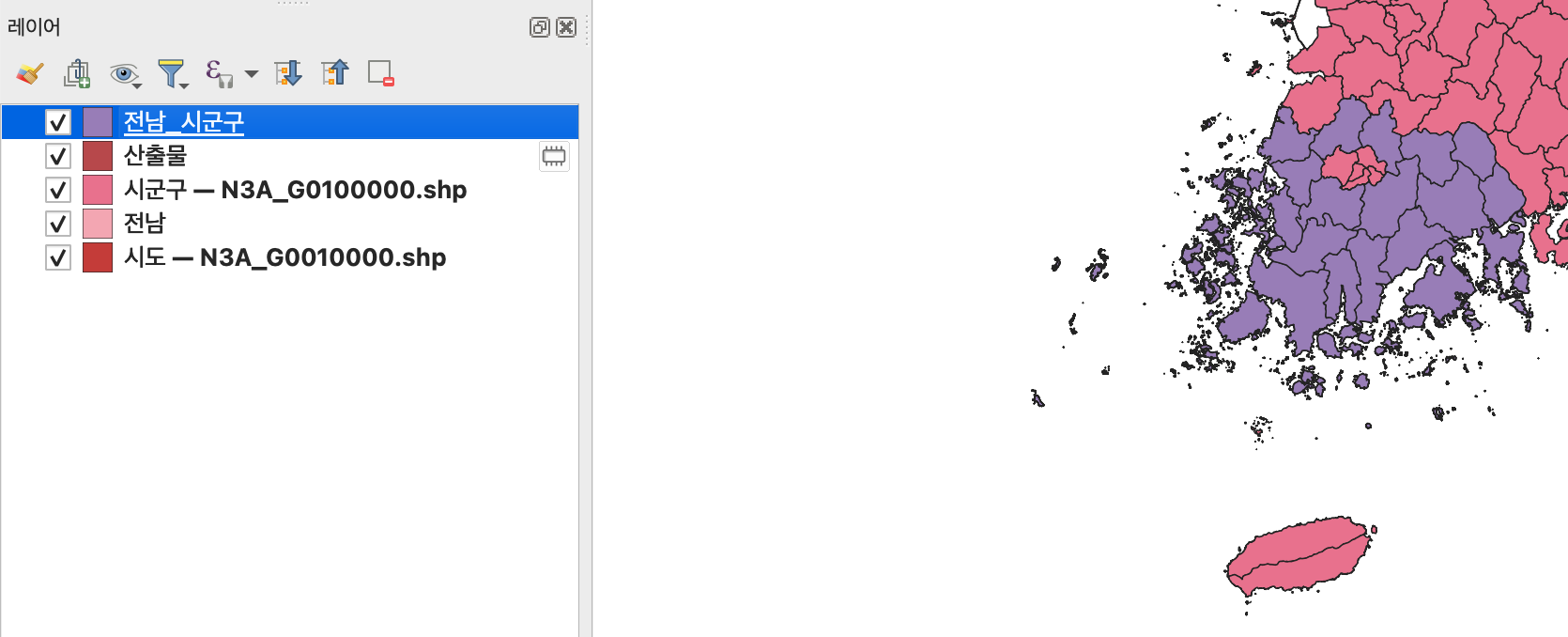아래와 같이 체크 표시를 지워주면 전라남도만 행정동으로 나뉘어진 것을 확인 가능하다.