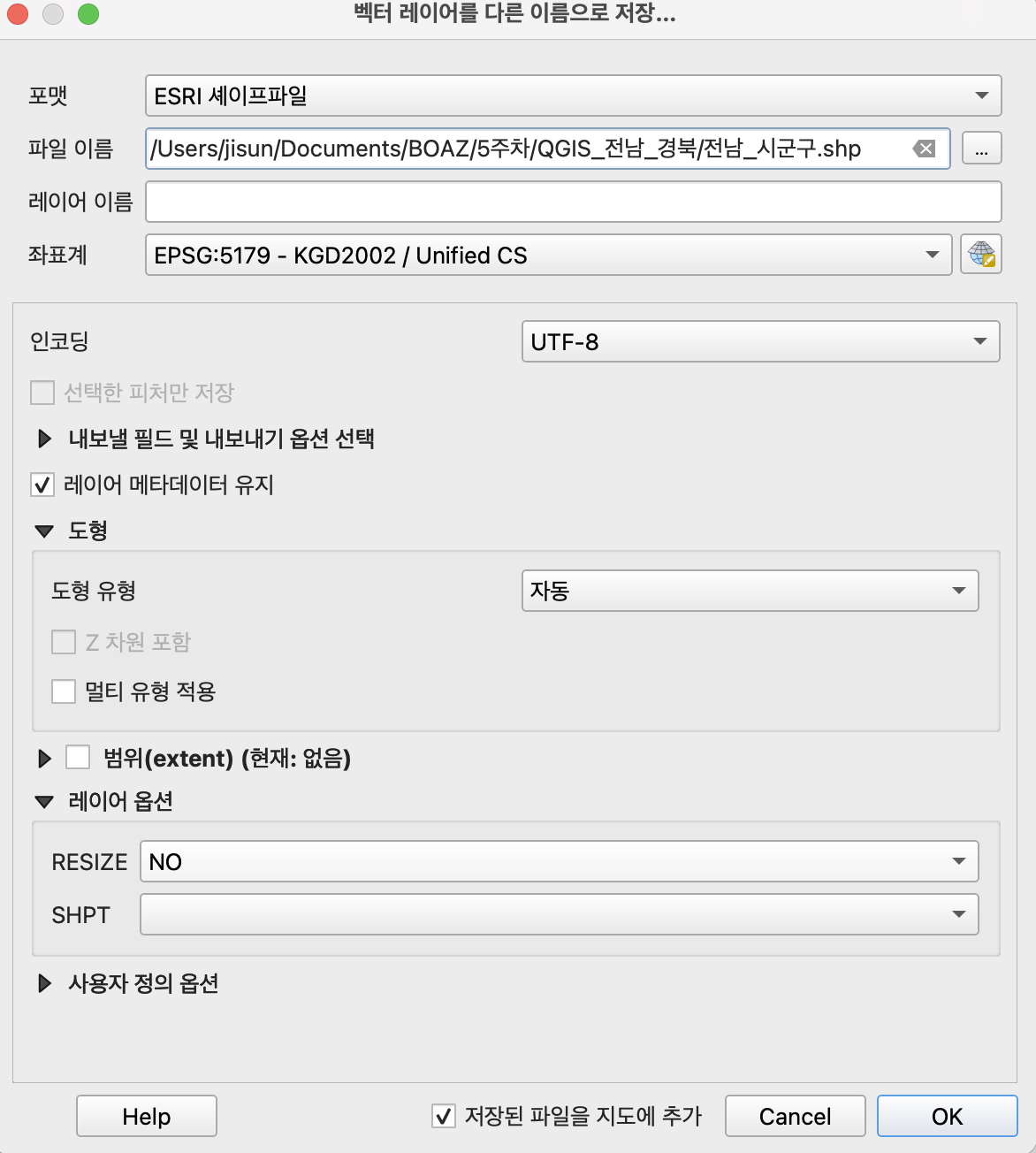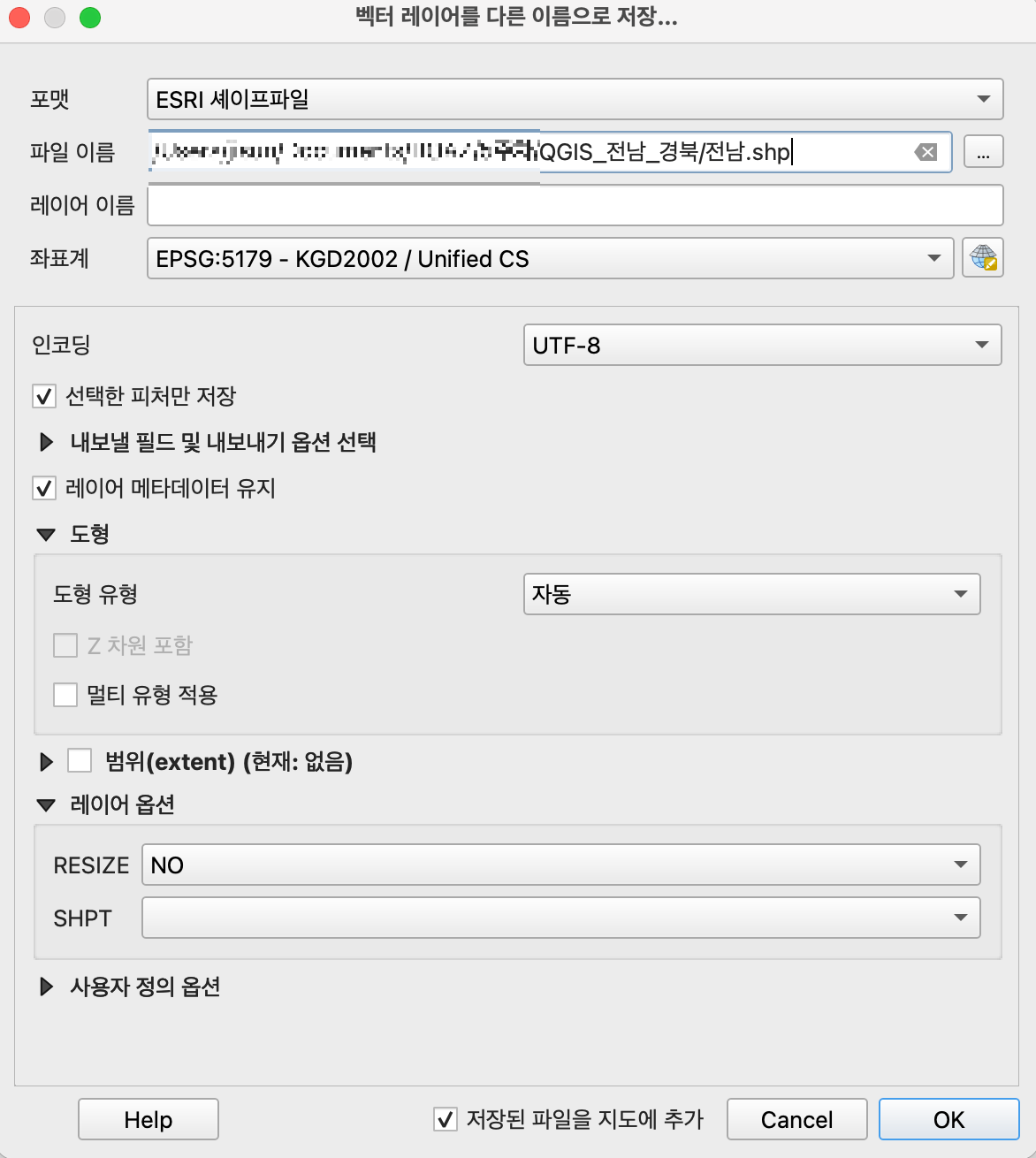 2-3. 처음 생성했던 폴더 내부에 전남.shp 라는 이름으로 저장