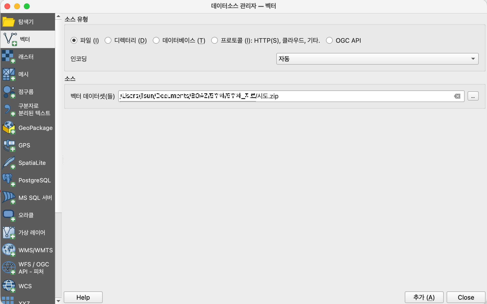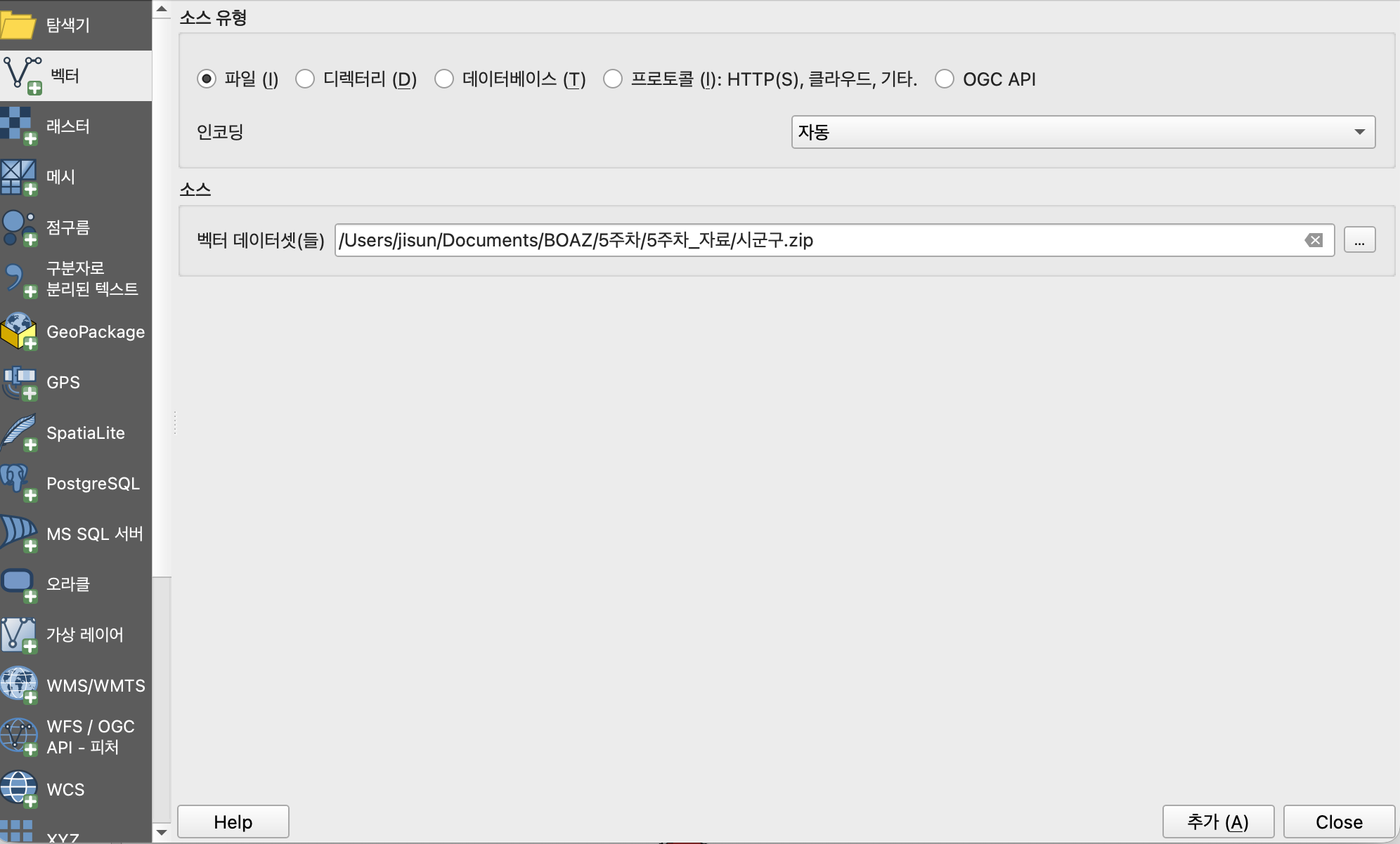 3-1. 시군구.zip 파일을 레이어 > 데이터소스 관리자 > 벡터 의 경로를 통해서 불러온다.