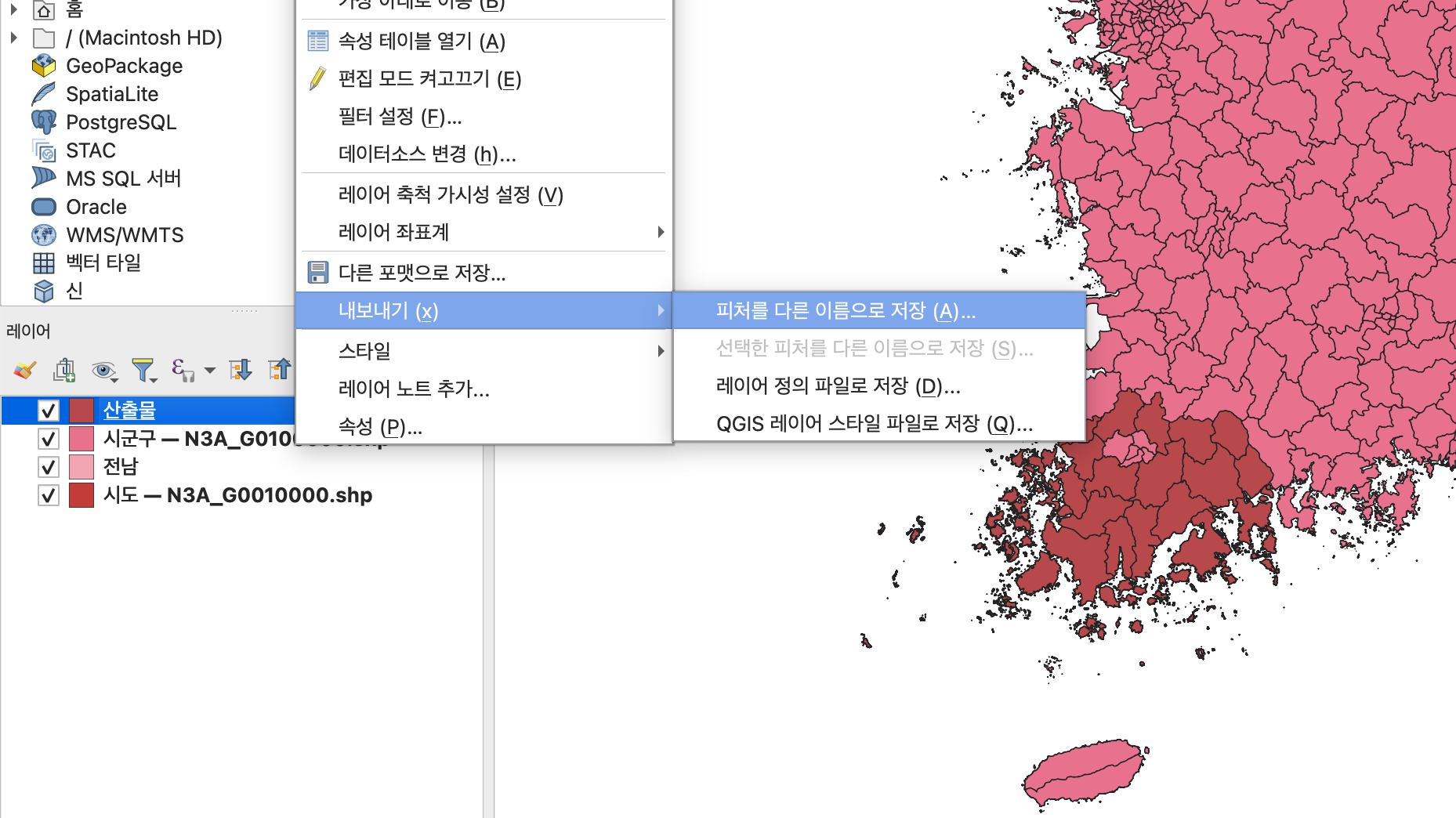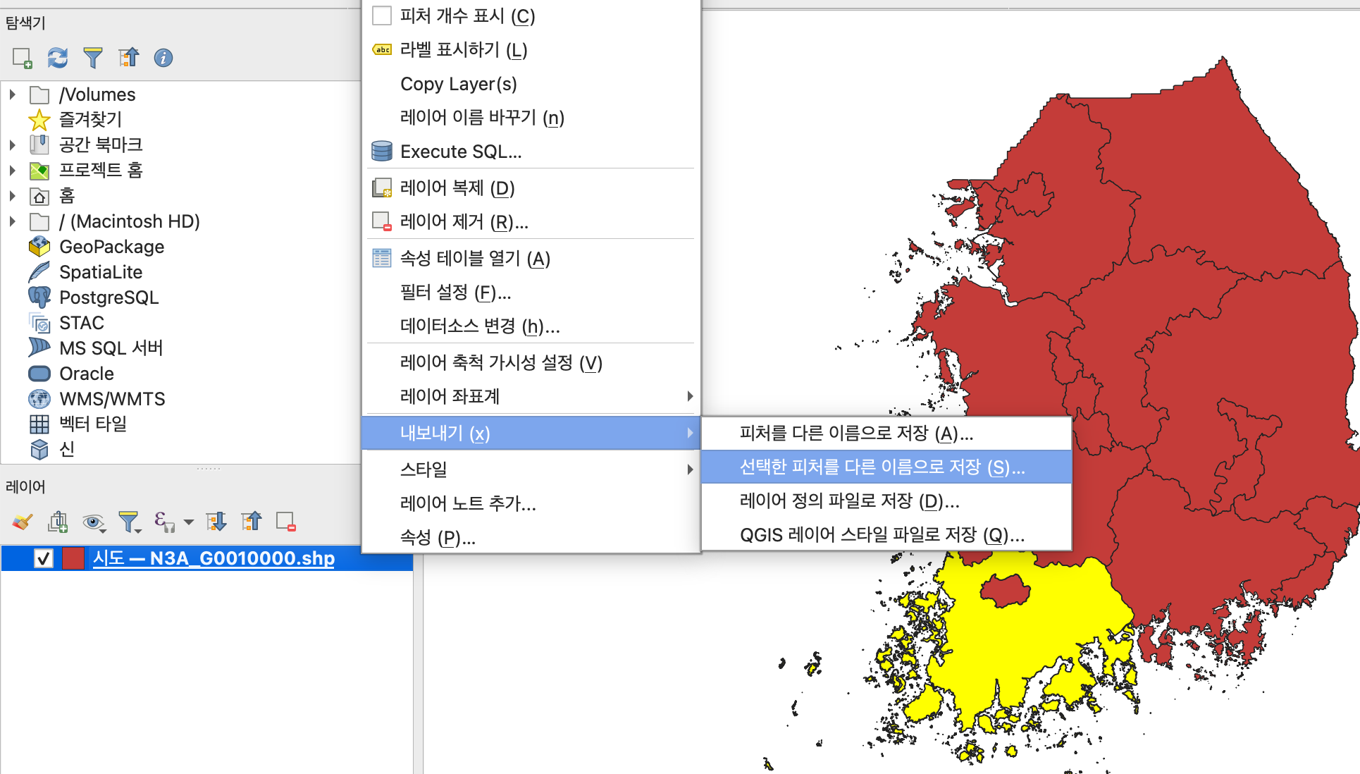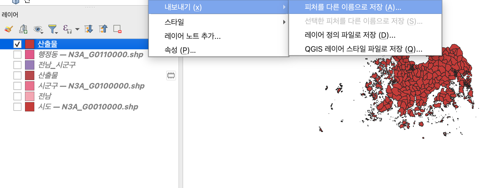 2-2. 레이어 > 내보내기 > 선택한 피처를 다른 이름으로 저장 을 클릭해준다.